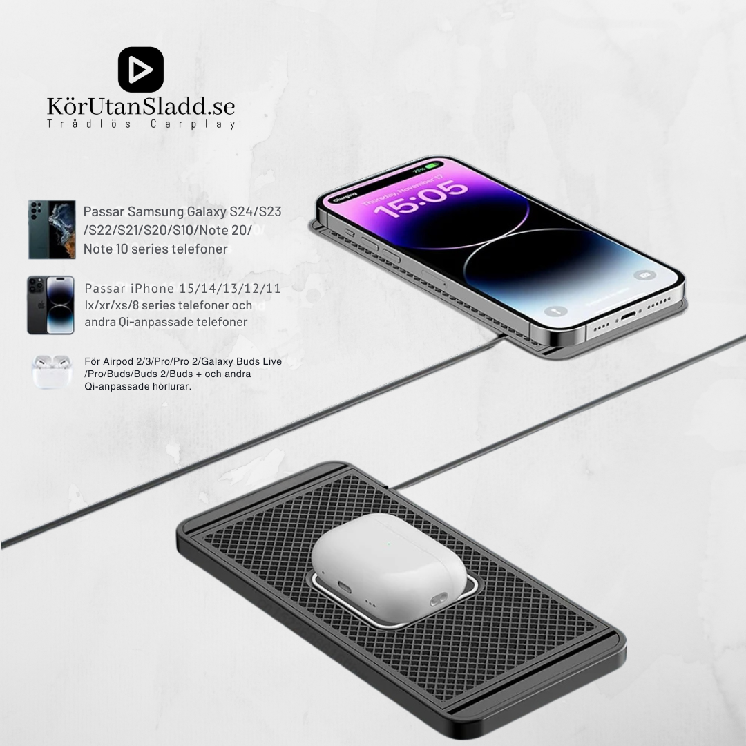 Denna Qi-kompatibla trådlösa laddningsmatta ger 15W snabbladdning till din enhet. Använd den hemma, på kontoret eller i bilen – kompatibel med de flesta telefoner som stöder trådlös laddning.