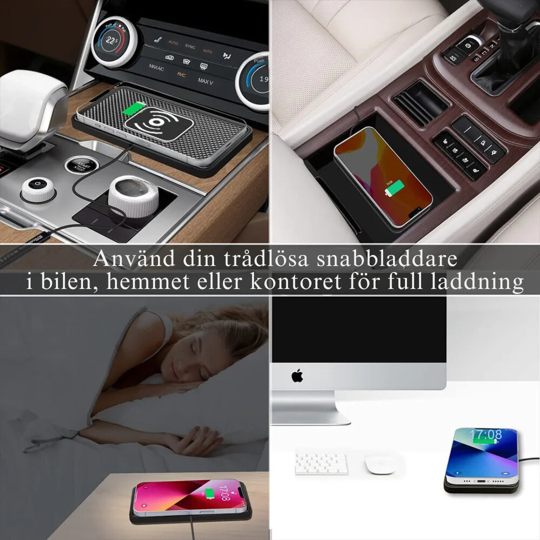 Vår snabbladdare är anpassad för alla Qi-anpassade telefoner. Oavsett om det är Android, IOS eller Airpods så kan du få full laddningen supersnabbt.